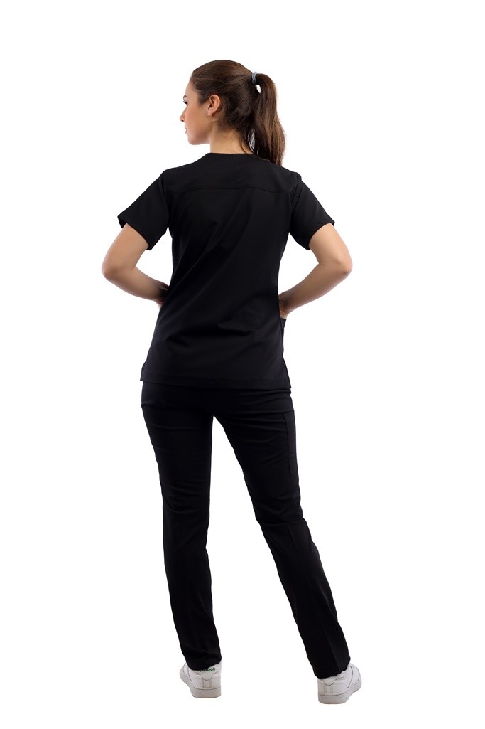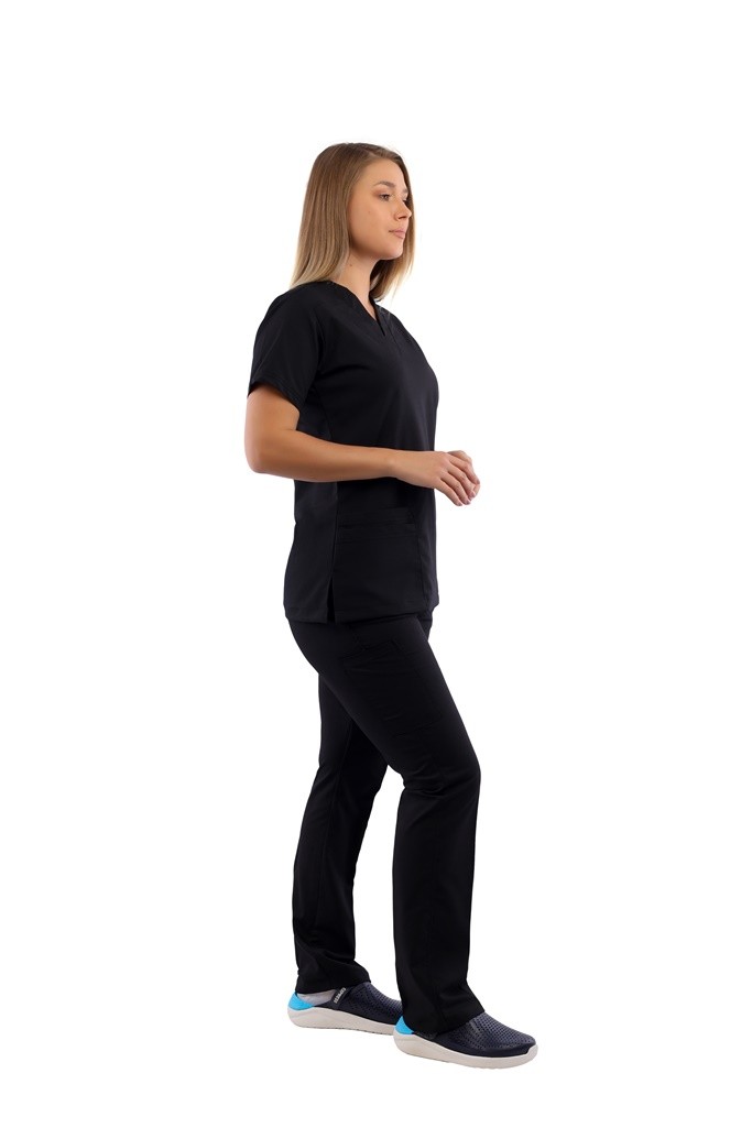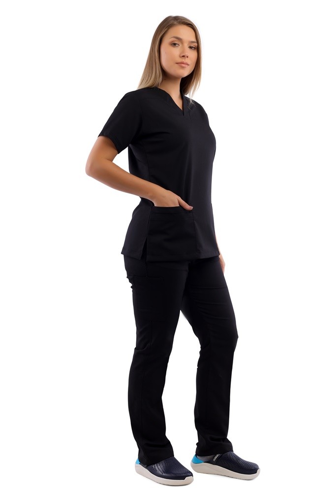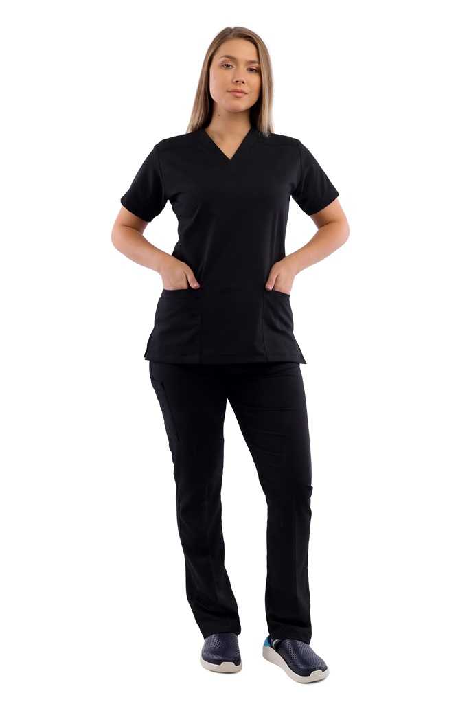 سكراب كلاسيكي جذاب برقبة على شكل حرف V مع جيبين أسفل التوب وبنطلون واسع، يعطيكي سهولة وحرية في الحركة علي مدار اليوم